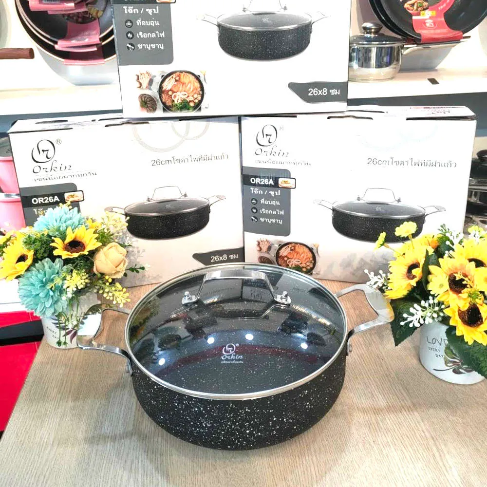 Tên sản phẩm: Chảo lẩu chống dính vân đá đáy từ Model: OR28A Thương hiệu: Orkin Thái Lan Công nghệ sản xuất Thái Lan Kích thước đóng hộp: 28 x 8cm (Dài cả cán: 38cm) Trọng lượng: 1.9 kg Chất liệu: Nhôm AL 003, lòng phủ chống dính vân đá cẩm thạch, đáy từ dầy 3mm Bề mặt bên ngoài: Phủ vấn đá cẩm thạch Quai cán: Quai inox 304, tán đinh chắc chắn. Vung: Vung kính cường lực kết núm inox 304 Màu sắc: Xám đen Sử dụng được trên tất cả các loại bếp: Bếp từ, bếp gas, bếp hồng ngoại,... Bảo hành 12 tháng chính hãng bởi Tập Đoàn Orkin Thái Lan - Việt Nam